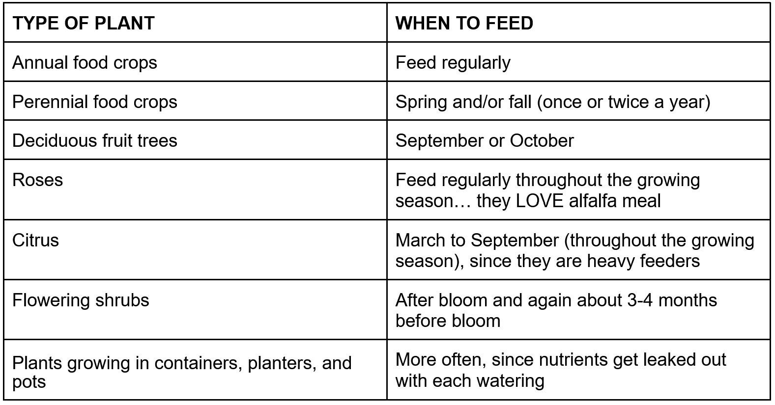 The right time to fertilize depends on the type of plant and whether it’s in-ground or in a container. Here’s a handy table to reference.